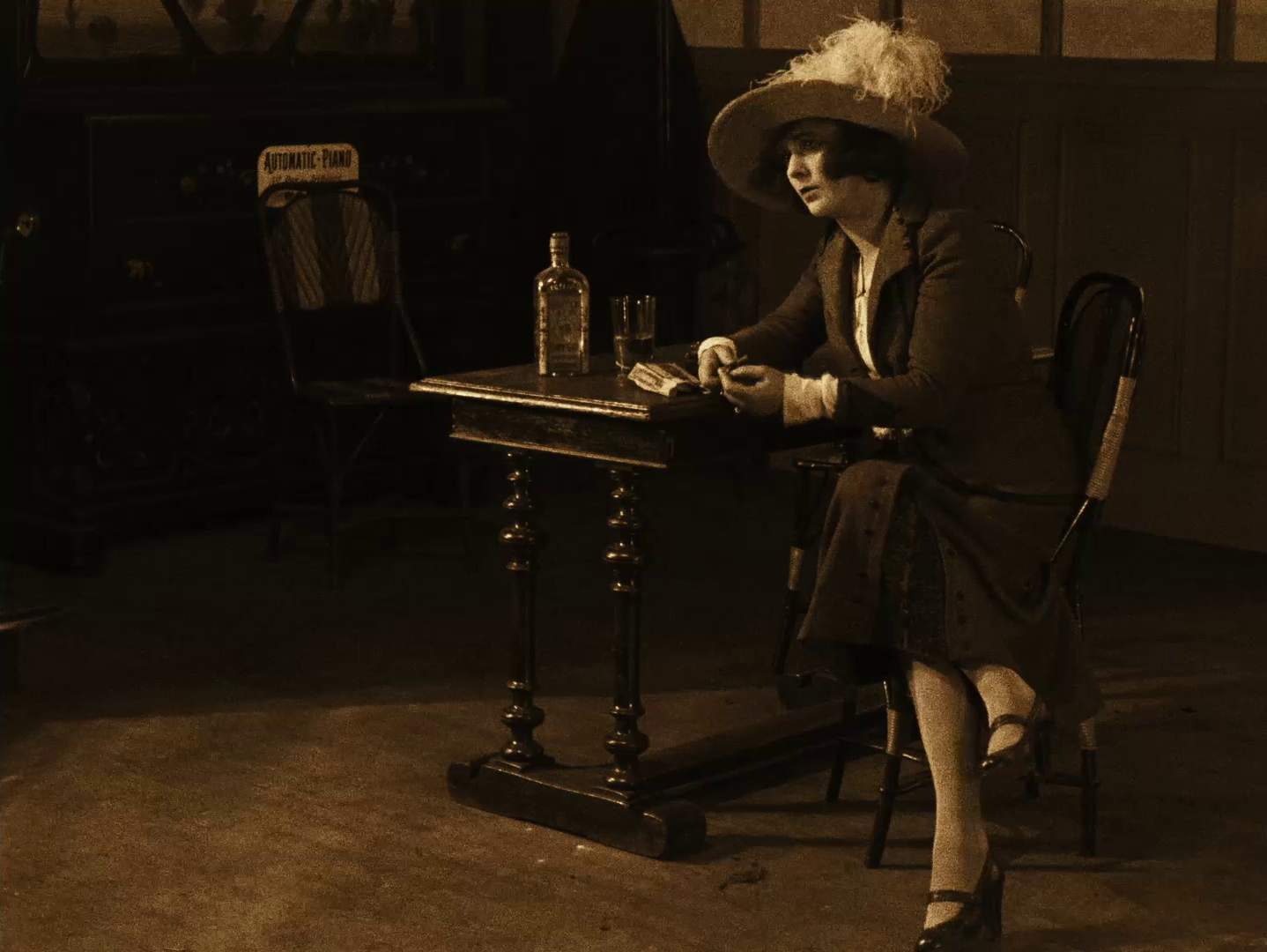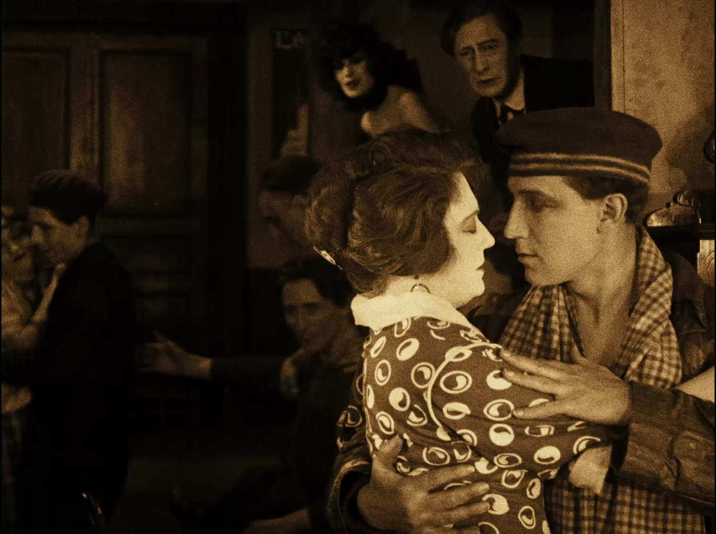 A whirlwind of sailors suddenly enters the cabaret. Patience carefully watches their arrival along with everyone else. Sarah's husband, the owner, hand-cranks the player piano as the men take their seats. They make themselves comfortable, lighting their cigarettes and talking among themselves. The cabaret's boss steps out and whistles loudly to get the attention of a group of local ladies (referred to as "The Women"), who step in shortly after wearing garish makeup and ostentatious attire. The film takes the time to introduce every prostitute and sailor back to back as they look to one another as if claiming their partners for the evening. The sole exception is Militis -- undoubtedly the group's boss -- who sits in the center, completely unconcerned, with hands deep in his pockets, a scarf loosely draped over his shoulders and revealing his chest in a worn-outm, low-cut shirt, like a thug standing on a dark street corner.